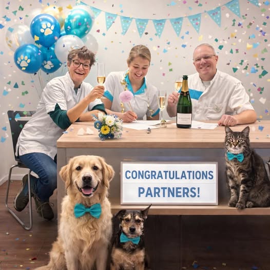 Een feestelijk moment gisteren! Onze dierenarts Pim Sonies is mede-eigenaar geworden van onze praktijk. Dus.. even tussendoor een klein slokje champagne! ( en een beetje extra versiering door AI)